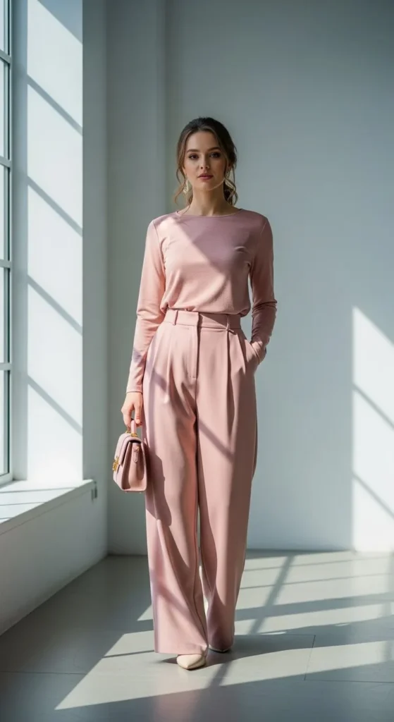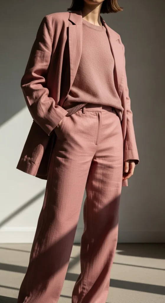 Blush tones feel gentle and spring-ready. A matching set keeps styling easy. Relaxed tailoring helps the outfit feel wearable rather than stiff. If matching pieces cost too much, mix similar shades. Matte fabrics work best here. Keep makeup and accessories soft to match the tone.