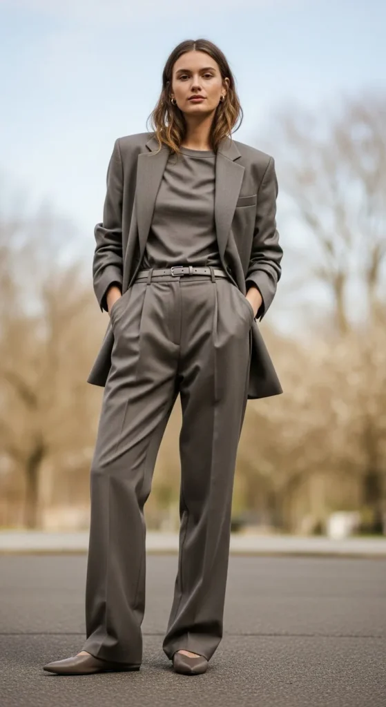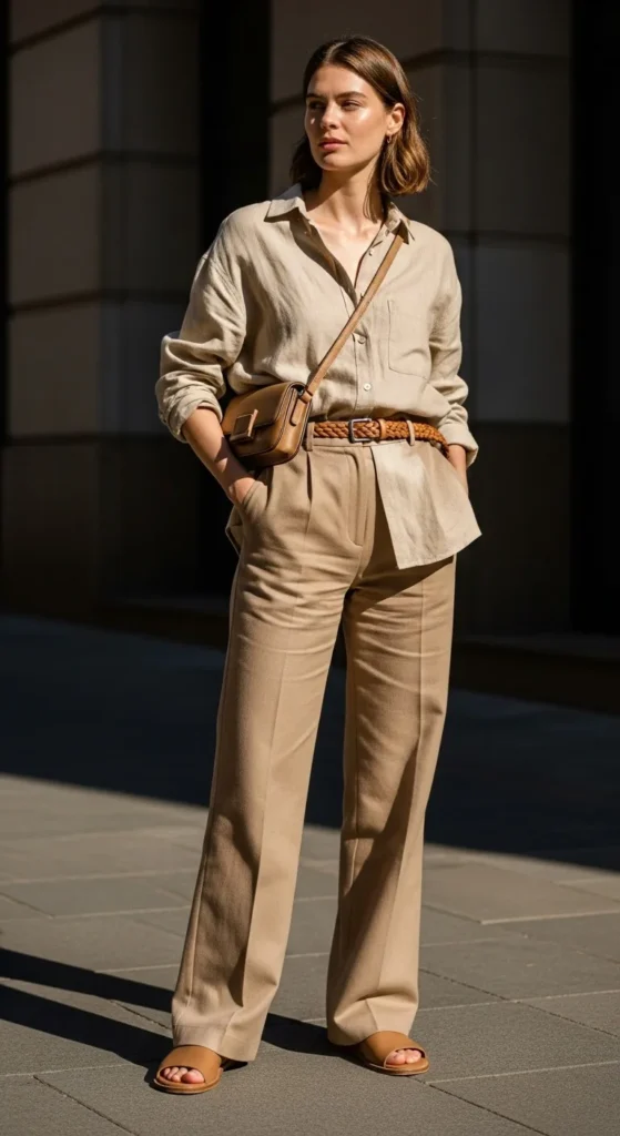 Stone shades feel relaxed and modern. Layer a light sweater over a tee and pair with matching pants. This look is easy to recreate using pieces already in your closet. Focus on matching tones and keeping fabrics light. Sneakers or flats work well.