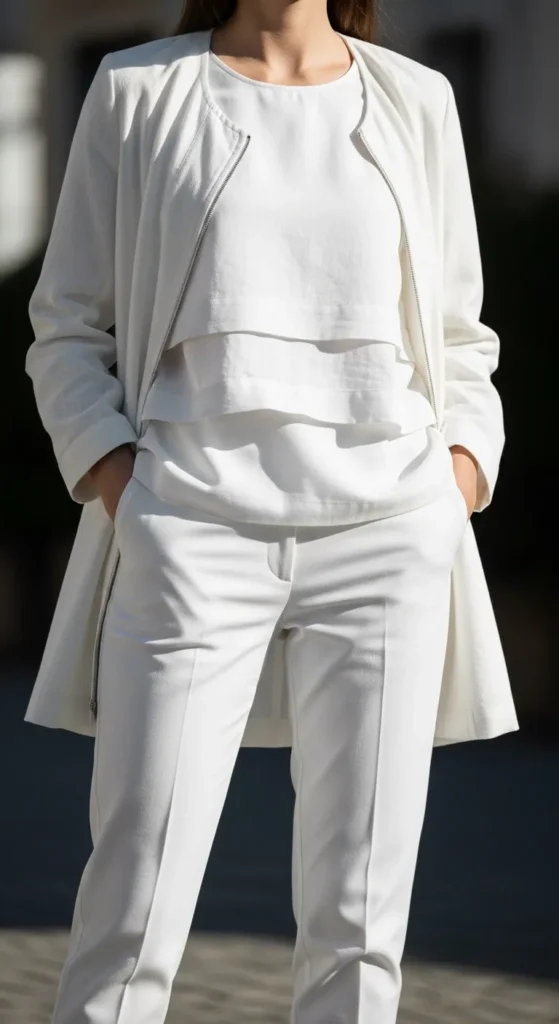 White outfits feel crisp when styled with layers. A white tee under a light jacket paired with white jeans or tailored pants works well. Mixing textures like cotton, denim, and light knit adds depth. Off-white and ivory are easier to manage than pure white and often cost less. Clean sneakers or flats finish the look. Carry a lint roller since white shows details fast. Simple prep keeps this outfit sharp all day.