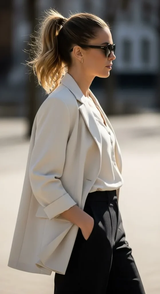 Ivory feels softer than white and more forgiving. Pair ivory trousers with a matching blouse and a light jacket if needed. Clean fits matter here, so avoid oversized pieces. Neutral shoes and minimal jewelry keep this outfit calm and work-ready.