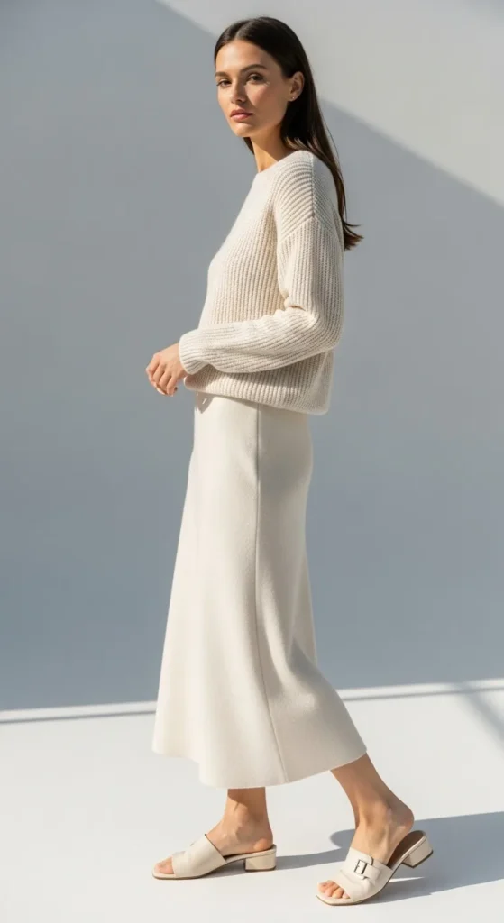 A cream knit top with a matching skirt feels relaxed yet refined. Choose a fine knit so it sits smoothly and does not add bulk. Midi skirts work best for spring. If matching sets cost too much, pair close shades instead of exact pieces. Flats or low boots keep the outfit practical. Keep jewelry simple with small hoops or studs so the look stays clean and soft.