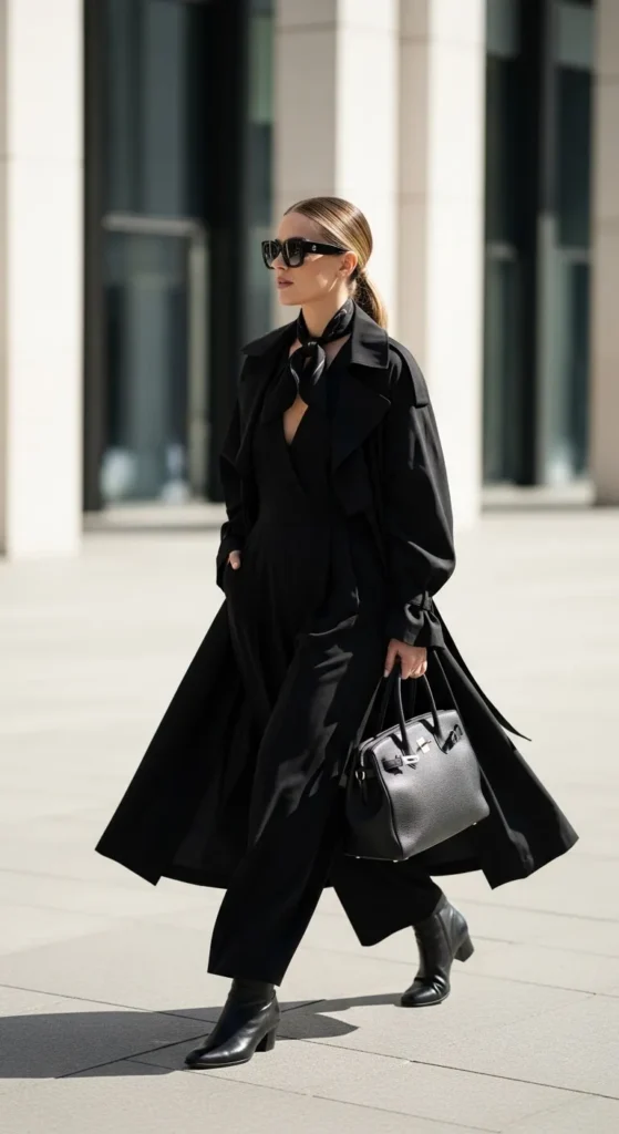Off-black feels softer than true black. Use light layers and airy fabrics to keep it spring-friendly. Most pieces already exist in many wardrobes, making this look easy to recreate. Clean lines help it work for many settings.
