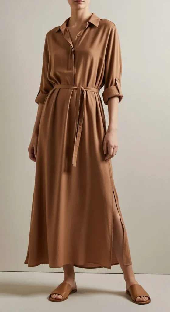 A camel shirt dress feels polished without effort. Look for a structured cut that holds shape. Add a belt in the same tone to define the waist. Thrift stores often have great shirt dresses at low prices. Pair with flats or sandals and keep accessories small for a tidy daytime outfit.