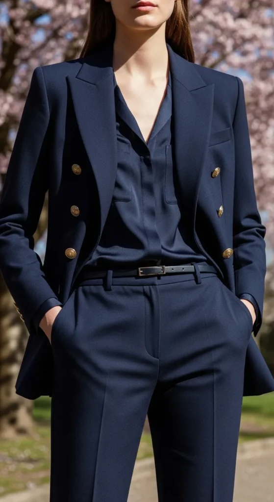 Navy feels softer than black but still sharp. A navy blazer with matching pants or a skirt paired with a navy tee works well. Navy hides wear, making secondhand pieces a smart choice. Stick to simple shapes and avoid extra details so the outfit stays clean and balanced.