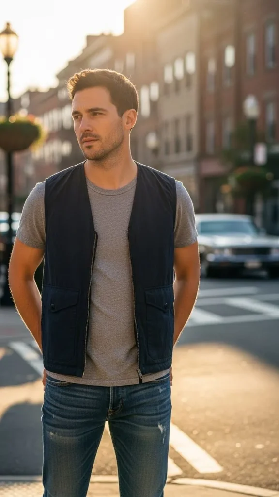 A casual vest layered over a T-shirt adds structure to a simple outfit. Pair with slim jeans or chinos. Neutral colors like navy, grey, or olive work best. Lightweight vests are affordable and practical for spring layering. Sneakers or casual loafers complete the look. You can roll T-shirt sleeves for a relaxed touch. This outfit works for casual meetups or outdoor lunches. Layering gives interest without extra effort.