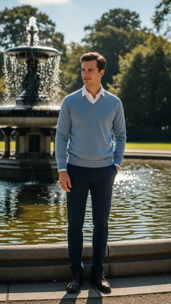 A v-neck sweater over a shirt creates a refined casual look. Choose light pastels or neutral colors. Pair with slim trousers or chinos. Leather shoes or loafers complete the outfit. Affordable sweaters are common in spring collections. Tuck in the shirt front for neat proportions. Optional accessories include a minimalist belt or watch. This outfit works for casual office days, meetings, or weekend lunches. Soft fabrics and classic cuts keep it approachable.