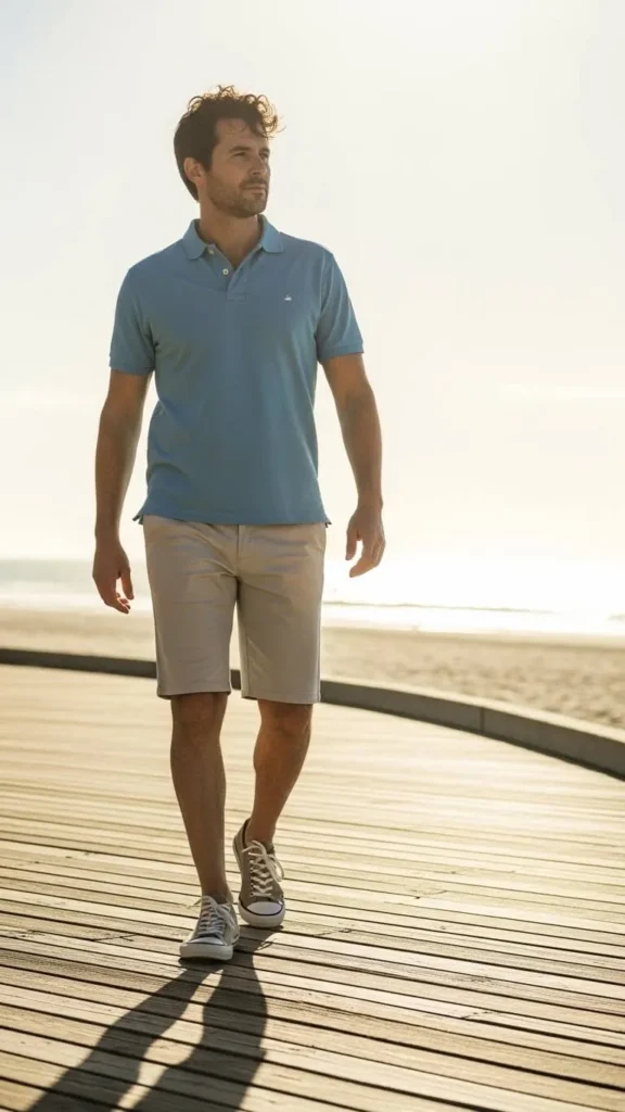 A polo shirt with shorts is simple and clean for warm spring days. Stick to soft pastels or neutrals. Choose tailored shorts for a sharp look. Sneakers or boat shoes complete the outfit. Affordable polos and shorts are easy to find. Tuck in the front of the shirt slightly for balance. Minimal accessories, like a watch, keep it tidy. This outfit is perfect for casual weekends, boardwalks, or brunch. Focus on color coordination and clean lines.