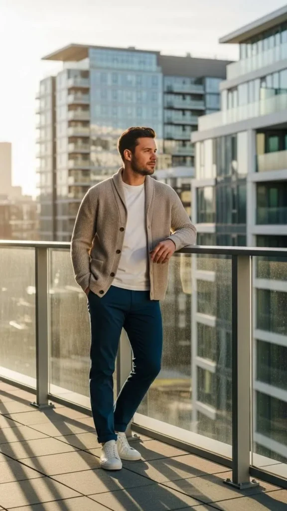 A lightweight cardigan over a T-shirt adds warmth and style. Pair with slim chinos for clean proportions. Neutral colors work best. Sneakers or loafers complete the outfit. Affordable cardigans are available in cotton blends. Roll sleeves slightly for a relaxed touch. Add a simple watch for detail. Perfect for casual spring evenings, coffee runs, or walks. The cardigan adds structure while keeping the look simple and approachable. Keep accessories minimal.