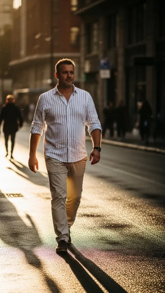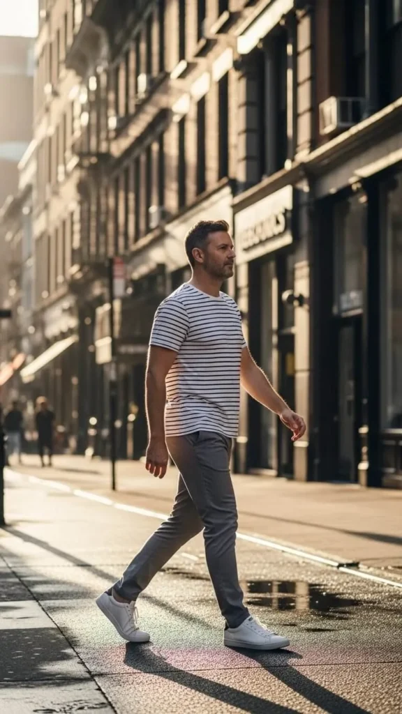 A striped button-down shirt paired with chinos is simple and clean. Opt for soft pastel or classic navy stripes. Chinos should be slim or straight-cut for balance. Sneakers, loafers, or desert boots complement the look. Affordable striped shirts are widely available, and rolling sleeves slightly adds casual flair. Add a minimal watch or leather bracelet for subtle detail. Perfect for brunch, casual Fridays, or light spring walks. Tucking in the shirt slightly at the front keeps proportions neat.