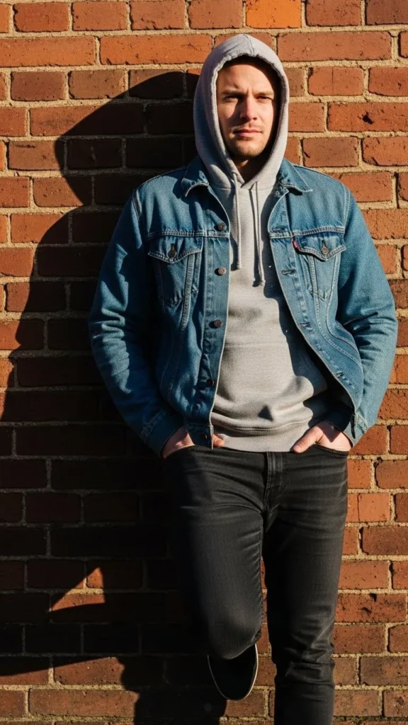 Layering a lightweight hoodie under a denim jacket creates depth while staying clean. Pair with slim jeans or chinos. Stick to neutral or soft colors for spring. Sneakers or casual shoes complete the outfit. Affordable hoodies and jackets are widely available. Roll hoodie sleeves slightly for casual flair. Perfect for spring evenings, casual hangouts, or city walks. Keep accessories minimal, like a watch or bracelet. Focus on layering and proportion for an effortless, tidy look.