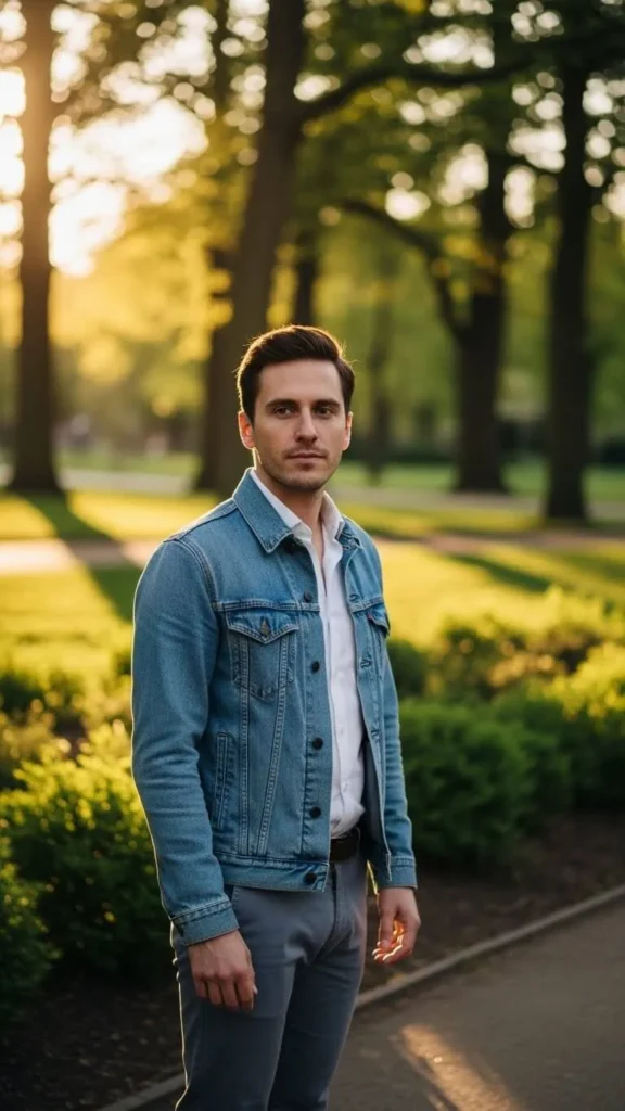 A denim jacket layered over a white shirt is timeless. Pair with chinos or jeans in muted tones. Sneakers or casual boots complete the look. Affordable denim jackets are easy to find, and washing them lightly keeps them soft. Tuck in your shirt slightly at the front for casual polish. Sunglasses and a minimalist belt are optional. This outfit is ideal for casual spring outings or weekend trips. You can roll jacket sleeves for a more relaxed feel without sacrificing style.