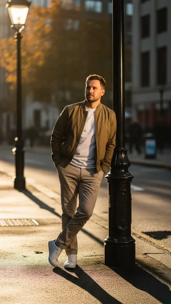 A lightweight bomber jacket instantly sharpens a casual outfit. Pair with chinos or slim trousers. Stick to neutral tones like khaki, olive, or navy. Sneakers or casual shoes work best. Affordable bomber jackets are common in spring collections. Add a casual watch or bracelet for subtle detail. Keep the T-shirt simple underneath. This outfit is perfect for cool spring evenings, weekend outings, or casual dates. Roll sleeves for a relaxed, stylish touch.