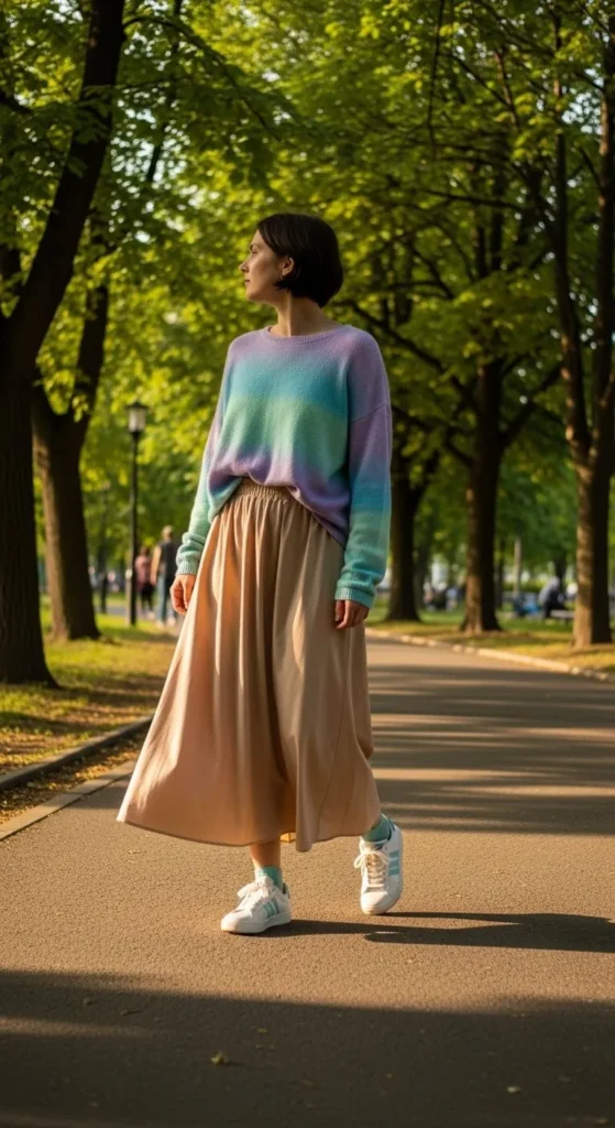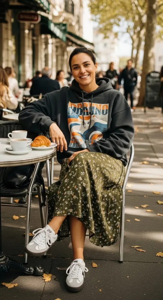 This mix feels relaxed and modern. Choose a simple midi skirt so the hoodie stands out. Sneakers keep it casual. Old hoodies work great here and don’t need replacing.