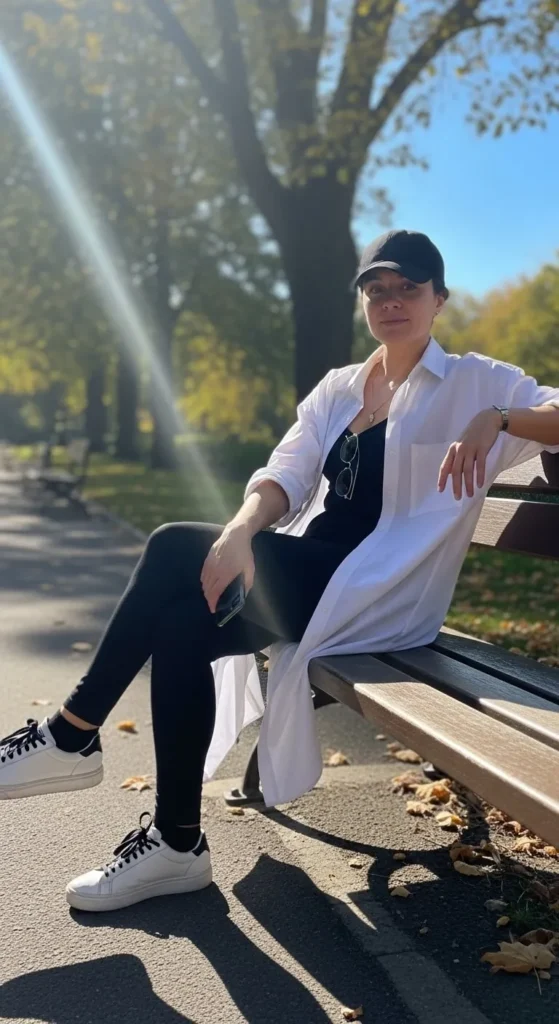 A long oversized shirt paired with leggings is simple and comfortable. Choose structured shirts to avoid a messy look. Sneakers or sandals keep it casual. You can lengthen a shirt by layering it over a longer tank underneath.