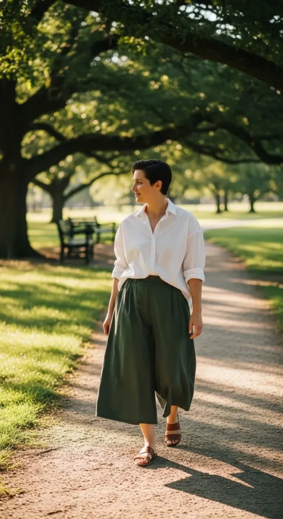 Culottes pair well with roomy tops. Tuck the front slightly to shape the outfit. Sandals or flats work best. Lightweight fabrics keep it spring-friendly and comfortable.