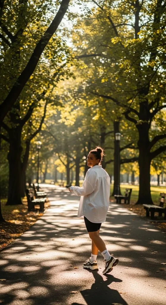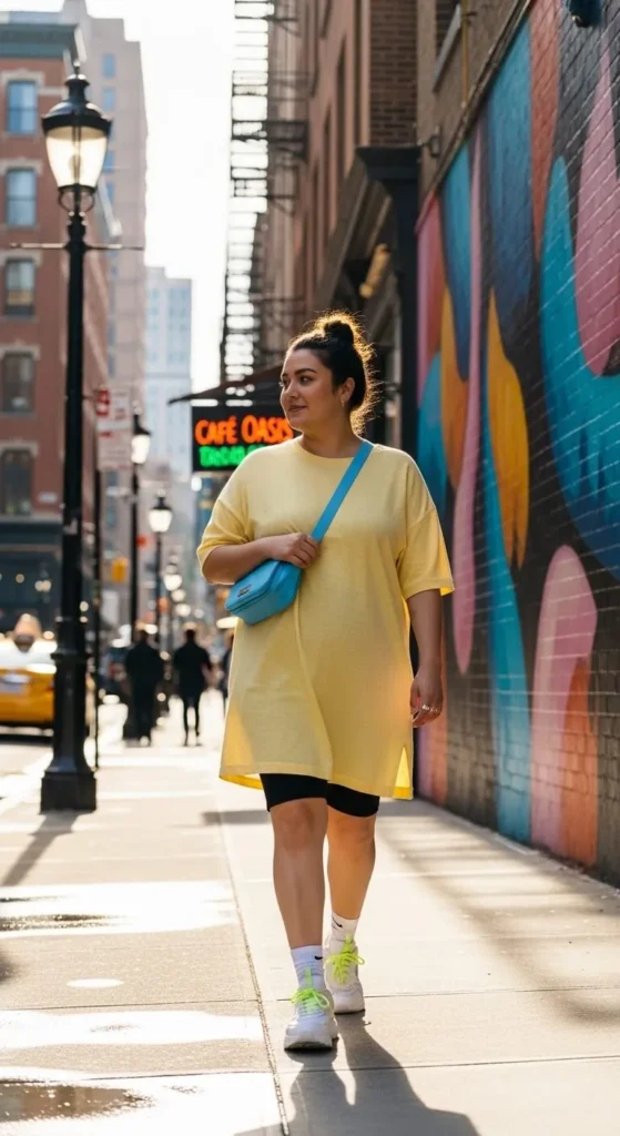 This combo is comfortable and practical. A long button-up shirt balances fitted bike shorts perfectly. Leave the shirt open over a tank or button it halfway. Neutral colors work best. Borrow a shirt from a family member or thrift one in a larger size. Finish with sneakers and a tote bag for errands or casual walks.