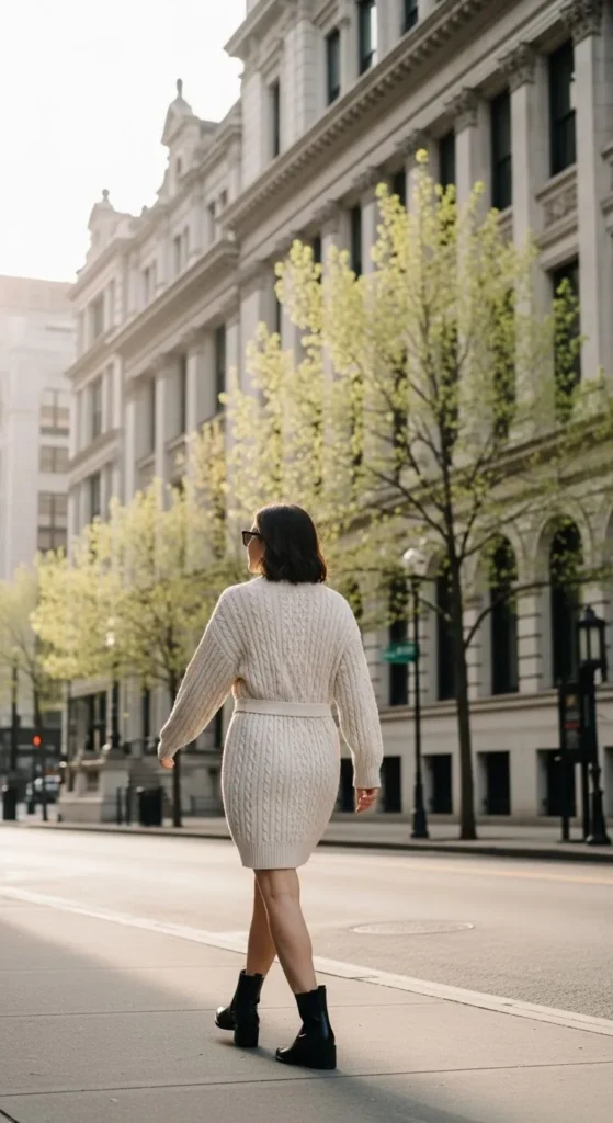 Lightweight sweater dresses are great for early spring days. Choose one that sits loose without clinging. Ankle boots or chunky sneakers keep it grounded. If the dress feels too baggy, add a thin belt or wear a crossbody bag to break up the shape. You can also turn an oversized sweater into a dress by pairing it with tights. Simple and affordable.