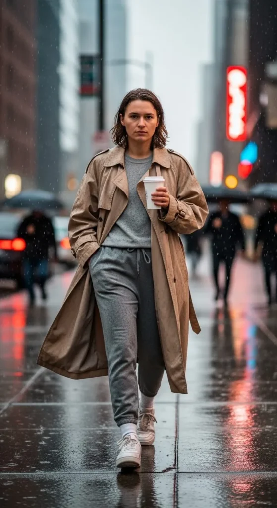 A long trench coat adds structure to relaxed joggers. This mix looks intentional and modern. Keep the joggers slim at the ankle and wear a simple tee or tank underneath. White sneakers work well here. You can find trench coats at thrift stores easily, and they often look better slightly oversized. This outfit works well for travel days or casual city walks.