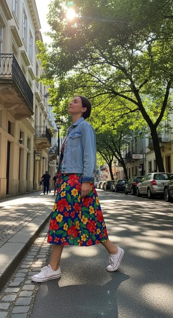 A boxy denim jacket tones down a soft floral dress and makes it wearable for everyday spring plans. Choose a cropped or straight-cut jacket rather than fitted styles. Sneakers or flat sandals keep it casual. If your denim jacket feels outdated, cutting the hem slightly shorter can give it a new shape without spending money.