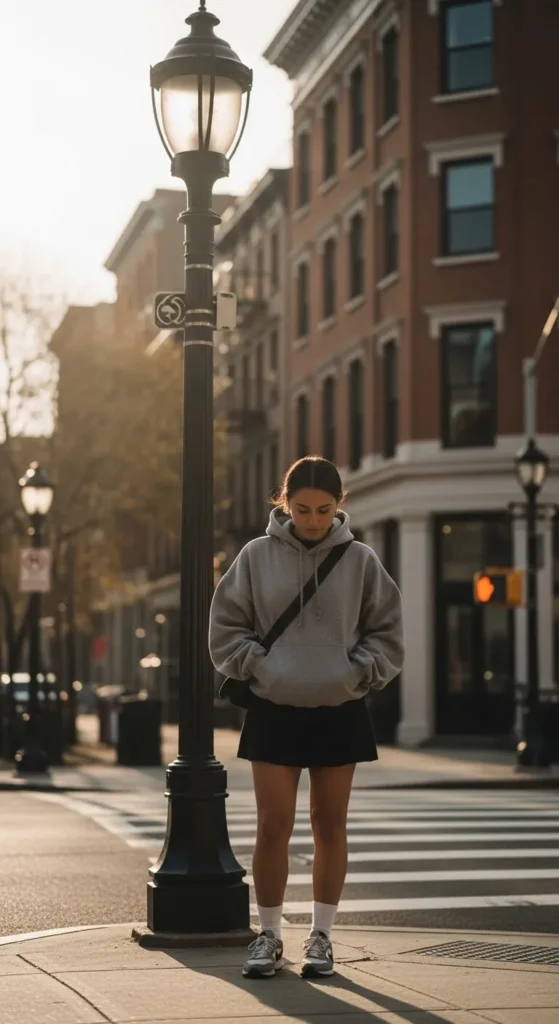 This outfit feels playful but balanced. Choose a hoodie that hits mid-hip or lower. Pair it with a simple mini skirt and sneakers. Neutral hoodies work best if you want a calm look. For shape, tuck the front slightly into the skirt waistband. Great for casual days without feeling sloppy.