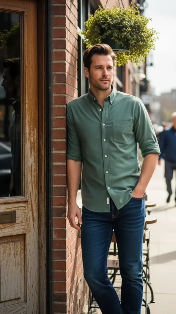 1. Classic Green Shirt and Dark Jeans