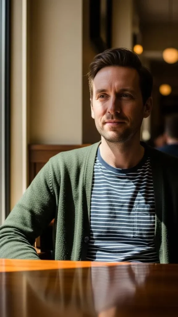 A green cardigan over a striped tee brings a friendly smart look. The stripes add fun while the cardigan keeps it calm. Wear with blue jeans or light chinos. Cardigans are often cheap in second hand shops. You can button only the middle button for shape. This outfit works for dates or family lunches. Slip on loafers or clean sneakers. The cardigan can be tied around shoulders later. It feels warm without heavy coats. Simple choices make the day easy. No need for new shopping bags.