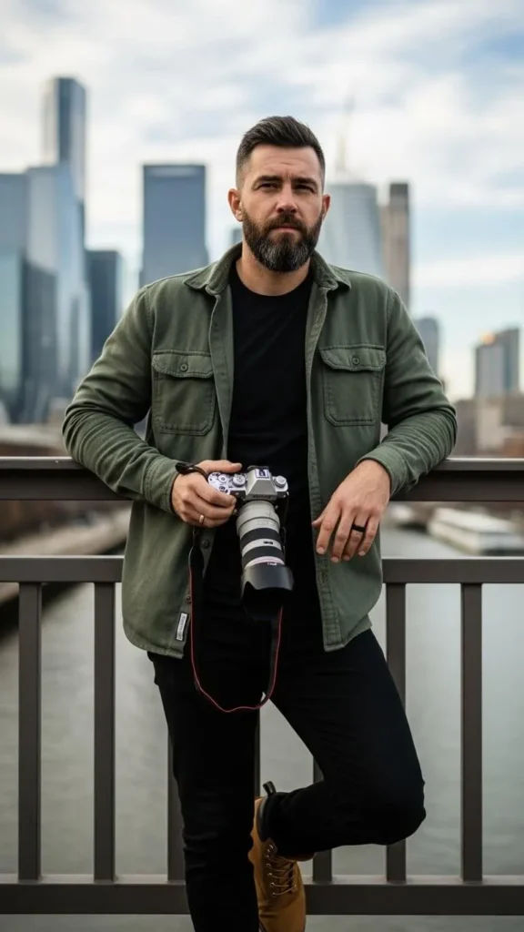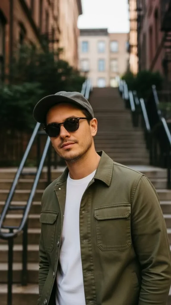A military style green shirt looks strong and clean. Pair it with dark jeans or cargo pants. The pockets add useful space for the day. You can find these shirts at thrift markets for low prices. Keep shoes simple so the shirt stays center stage. This outfit fits outdoor music events and street food walks. Add a plain belt to shape the waist. If the shirt feels stiff, wash it once to soften the fabric. The style looks natural on many men. It gives a confident feel without loud prints. Easy to repeat on any weekend.