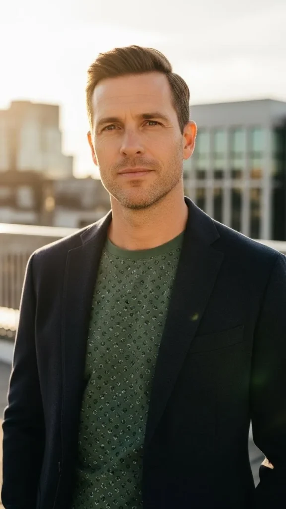 A small pattern green shirt under a blazer looks sharp for dinners. The blazer can be the one you use for weddings. Dark pants finish the outfit. This idea mixes formal and fun in a calm way. Look for shirts on sale racks to save money. Keep the pattern tiny so it does not shout. Brown shoes add warmth. The blazer can be removed later at the pub. This style shows you made an effort without stress. Easy to repeat for other events.