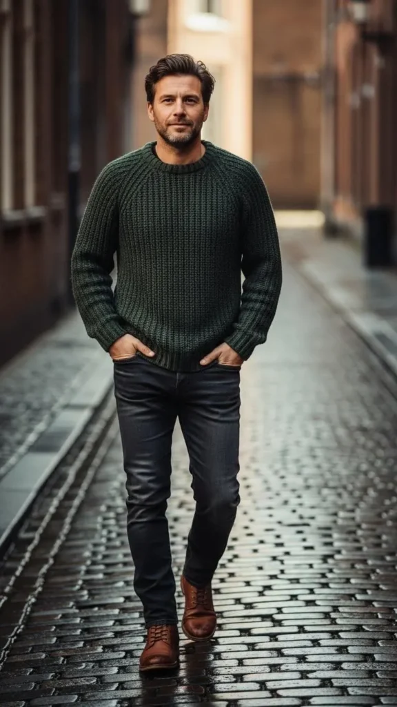 A green sweater paired with brown boots brings a classic feel to the day. Choose a sweater that is not too thick so you can stay indoors comfortably. Brown boots add shape and make the outfit look planned. Blue jeans or khaki pants both match well. If you have an old sweater at home, give it a quick wash and it will feel new again. This style fits family dinners or evening events. Add a simple scarf if the wind picks up. You can borrow boots from a friend instead of buying new ones. Keep the rest of the colors calm to avoid a busy look. The sweater can be folded over the shoulders when it gets warm. This idea mixes comfort with a touch of smart dressing. It works for many ages and body types.