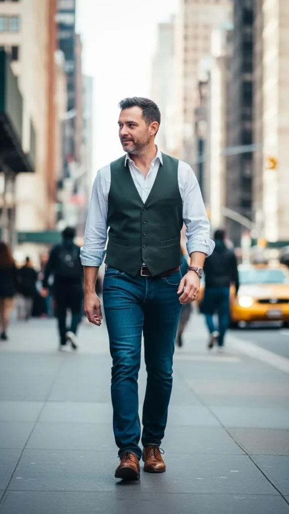 A green vest over a white shirt gives a neat layered look. The vest can be thin so you do not feel hot. Pair with dark pants and simple shoes. This idea suits men who like tidy outfits. Vests are easy to find at low cost online. You can adjust the back strap for a good fit. The white shirt keeps the face bright in photos. This look moves well from day to night. Add a simple bracelet if you want a personal touch. Layers help you stay ready for changing weather. Clean and easy to copy.