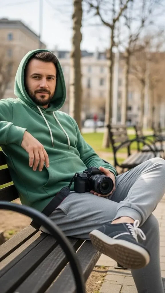 A green flannel shirt brings warmth and pattern without being loud. Pair it with black pants to keep the outfit simple. Flannel is easy to find at low cost in second hand stores. You can wear it open over a plain tee or buttoned up. This look suits cool mornings and late night walks. Add sturdy sneakers or work boots for balance. Roll the sleeves to stay relaxed. If your flannel is old, sew a loose button back on as a quick fix. The outfit feels friendly and ready for photos. It also hides small stains from food or drinks. Many men already own a flannel, so it saves money. Comfort and style meet in this easy choice.