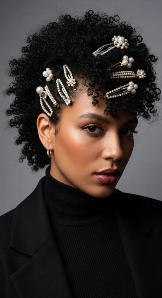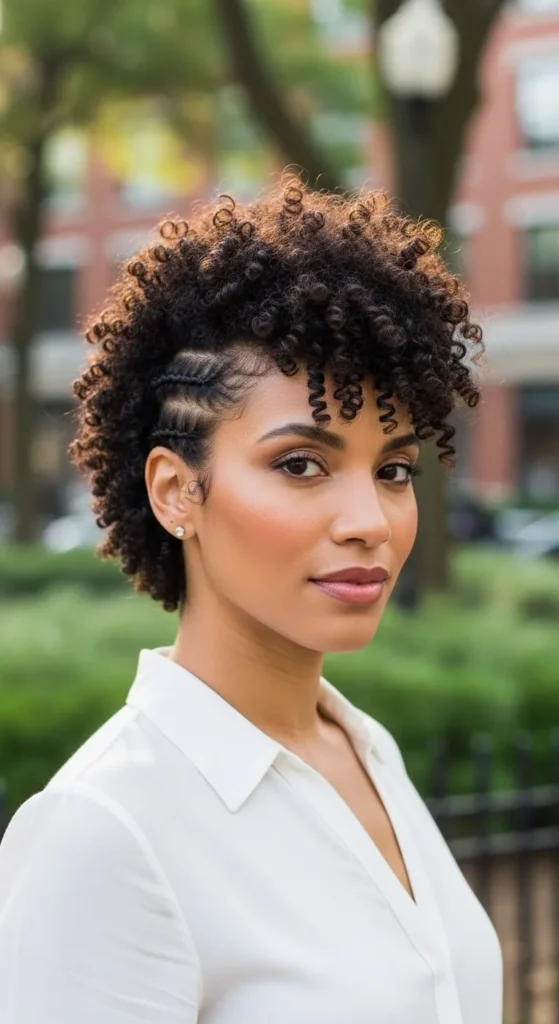 The frohawk keeps curls full in the center with pinned sides. Moisturize hair first. Pin sides upward using clips. Use light gel for hold. Remove pins at night. Add scarves or clips for variety. This style works well for parties and photos while protecting edges.