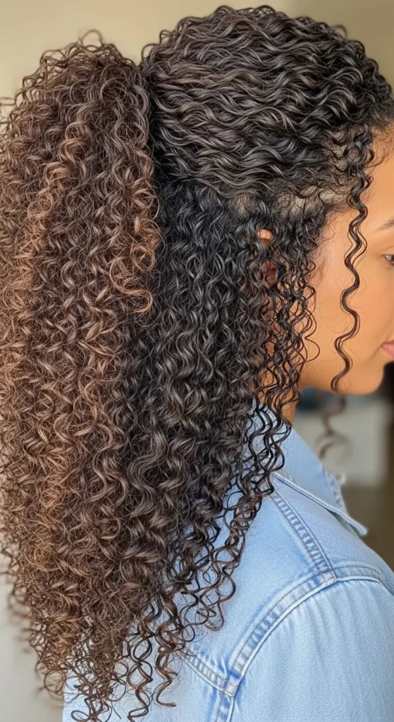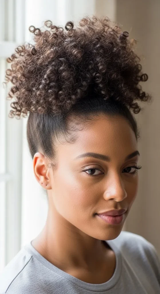 The high puff lifts curls upward and creates instant volume. Lightly mist hair, apply curl cream, and brush sides gently. Secure with a soft band or scarf. Use aloe gel for edges if needed. Avoid strong gels that flake. Stretch hair at night with loose braids to increase puff size. This saves time and money. It works well for busy mornings, workouts, and quick outings. It also protects ends from rubbing against clothes.