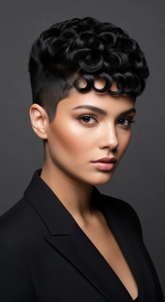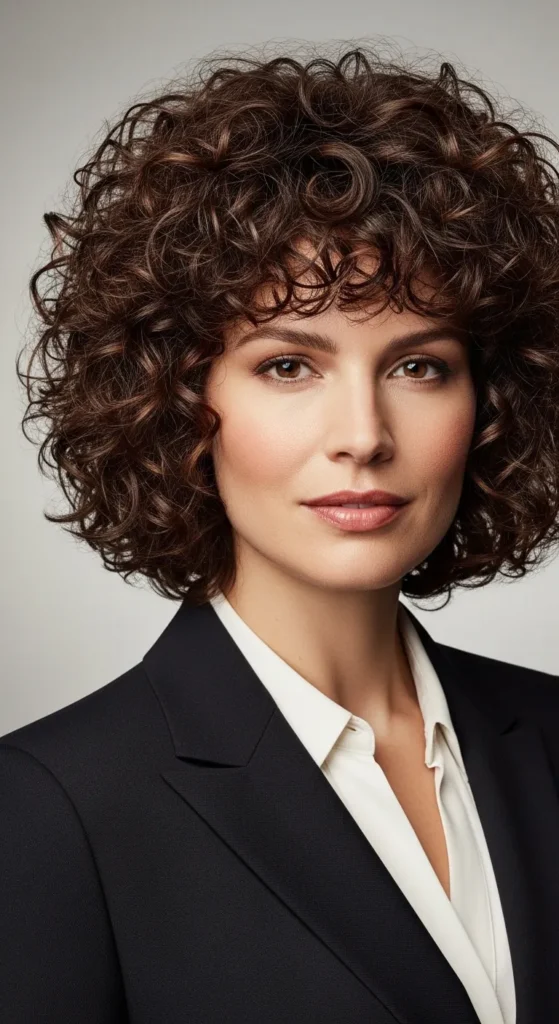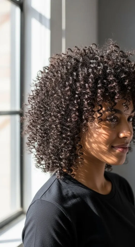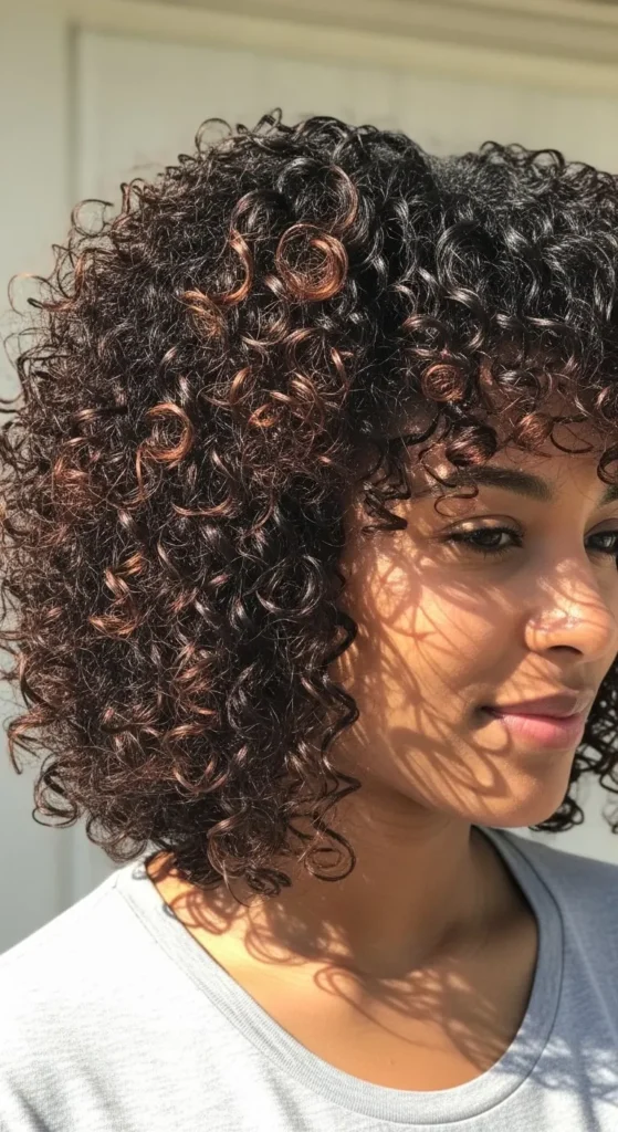 Curly bangs frame the face. Trim slowly. Moisturize daily. Style with cream. This look feels bold and youthful. Easy to refresh.