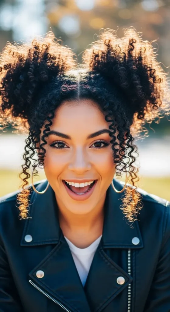 Part hair and create two puffs. Secure gently. Add scarves for fun. This style protects ends and works for casual days. No special tools needed.
