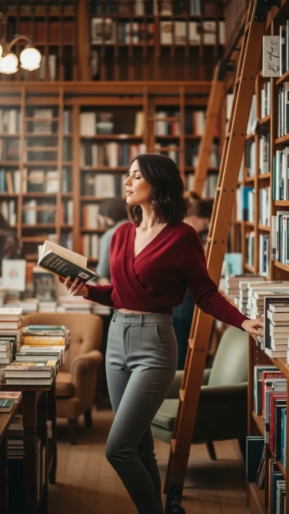 Wrap sweaters flatter most shapes and add softness. Burgundy is rich but still casual. Pair with slim pants for a streamlined yet comfortable look. Budget shoppers can find wrap styles on discount sites or gently used in thrift stores.
