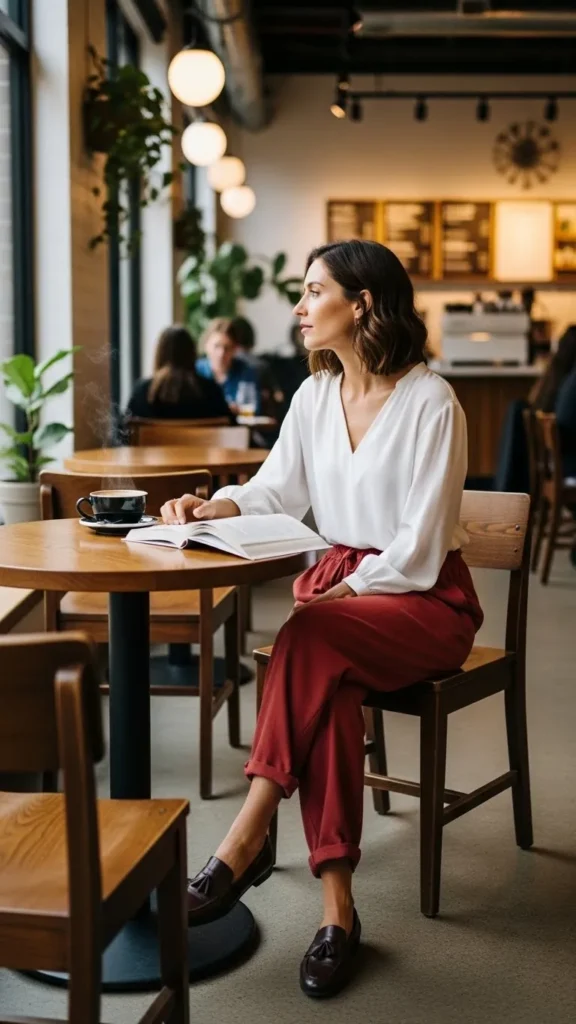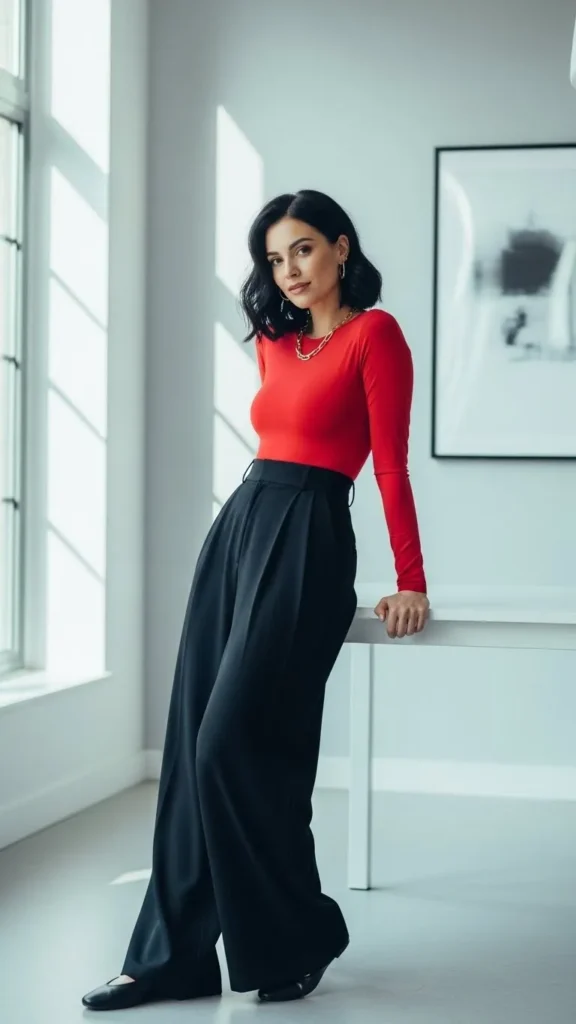 A red bodysuit tucked into wide-leg trousers blends casual and sharp. You don’t need fancy brands; bodysuits and trousers can be picked up at affordable retailers or altered for shape. Add flats and a small backpack for an everyday yet polished feel.