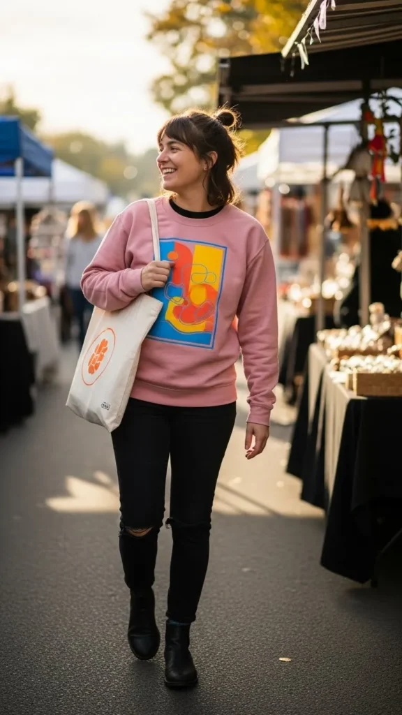 Graphic sweatshirts add personality and a casual tone. Choose soft pink to hint at Valentine’s without being too strong. Black jeans are neutral, affordable, and go with everything. DIY options include screen-printing your own sweatshirts cheaply or repurposing old graphics.