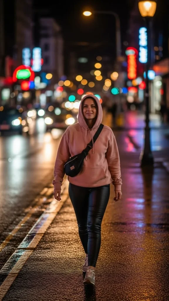 Pink hoodies are cute and casual, while black leather leggings add a bit of edge without being overwhelming. Look for faux leather options to stay budget-friendly and insert pink through a thrifted or sale hoodie. Put on sneakers or flats depending on your plans.