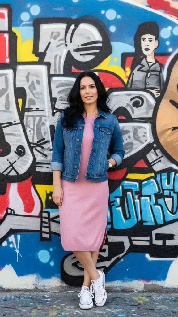10. Pink Knit Dress with Denim Jacket