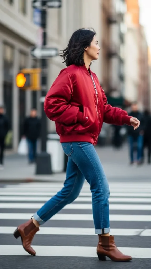 23. Red Bomber Jacket with Jeans and Boots