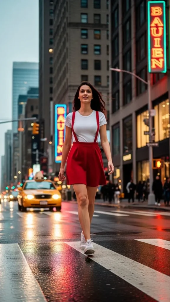 Simple can be sweet. A white tee and red suspender skirt is playful and budget-friendly. You can find secondhand skirts or even DIY one by altering an old dress or skirt. Keep accessories minimal to highlight the fun color combo.