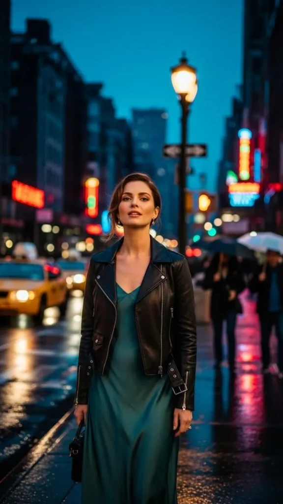 A leather jacket adds contrast to a soft dress. This outfit works well for night plans or casual dinners. If leather is not in your closet, faux options are widely available and affordable. Keep the rest of the outfit simple so the jacket stands out naturally.