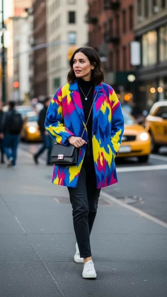 A bold coat can carry your whole outfit. Wear simple clothes underneath and let the coat do the work. This is a smart way to reuse basics while still looking styled. Neutral shoes keep everything balanced.