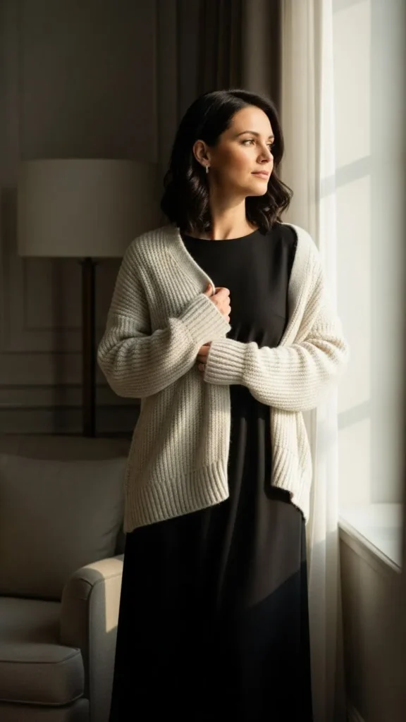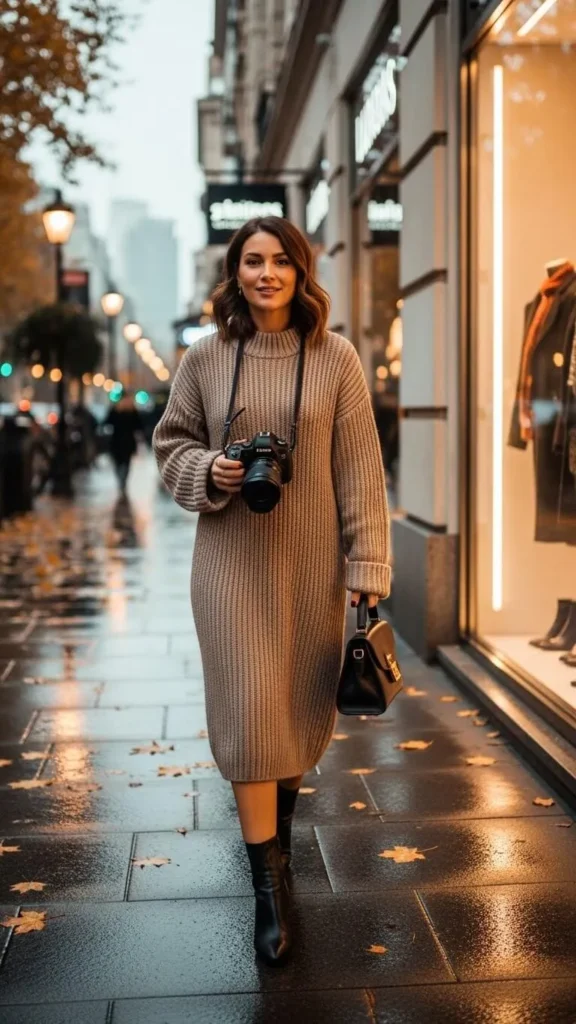 A knit dress feels cozy while still looking put together. Pair it with ankle boots for a simple finish. Neutral colors give you more wear later. If you want more shape, add a belt you already own. This outfit works well for casual dinners and evening walks.