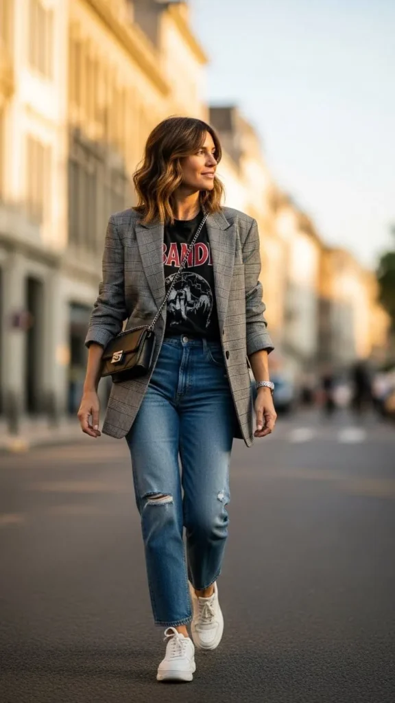 A graphic tee keeps the outfit casual and fun. Adding a blazer gives it structure. This mix works well for laid-back dates. Use items from your closet to keep costs low.