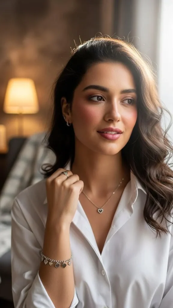 A white shirt is a classic piece that works year-round. For Valentine’s Day, add heart-shaped earrings or a small themed bag. This brings in the mood without buying new clothes. Pair with jeans or trousers depending on your plan. The result feels clean, playful, and budget-friendly.