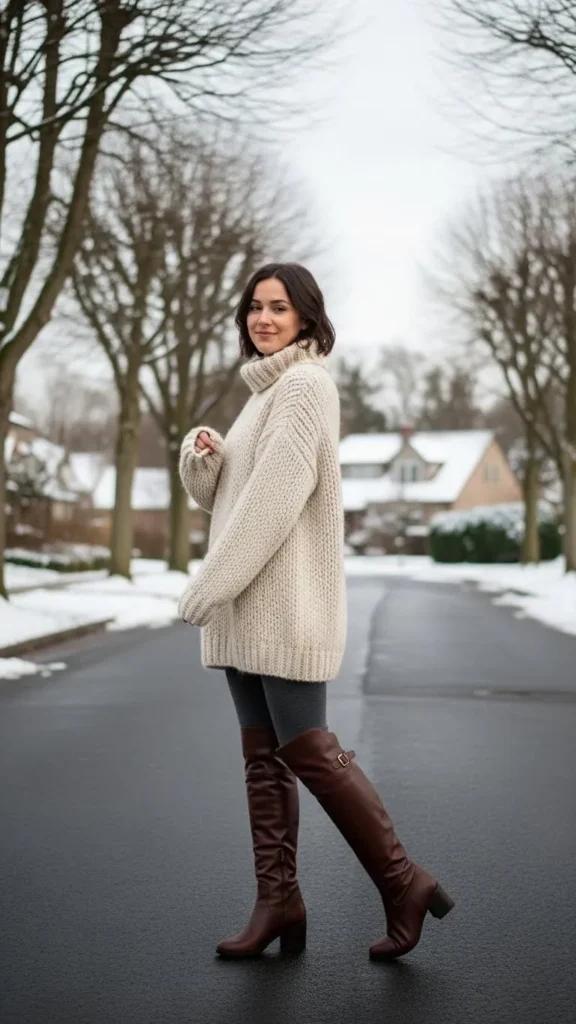 Knee high boots and an oversized sweater make winter dressing feel relaxed and warm. Start with a soft sweater that covers the hips. Add simple leggings or slim jeans. The boots bring structure so the outfit does not feel sloppy. Neutral colors like beige, black, or gray keep it easy. If your sweater feels too long, add a thin belt over it to shape the waist. This works well with boots that have a flat sole. For colder days, layer a thermal top under the sweater. Thrift stores are great places to find oversized knits at low prices. If boots feel tight, wear thin socks and add warm insoles instead of thick layers. This outfit works for errands, casual meetups, and travel days. Keep accessories simple. A tote bag and small scarf are enough.