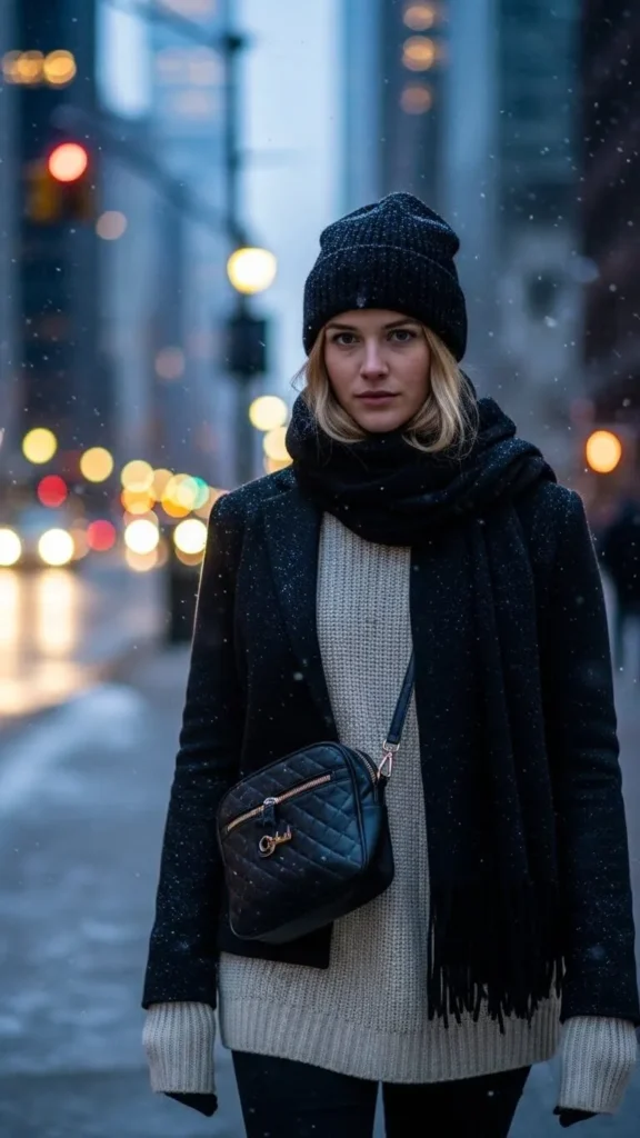 Chunky boots stand out. Keep clothing one color to balance. This outfit feels simple and modern. Focus on comfort and warmth.