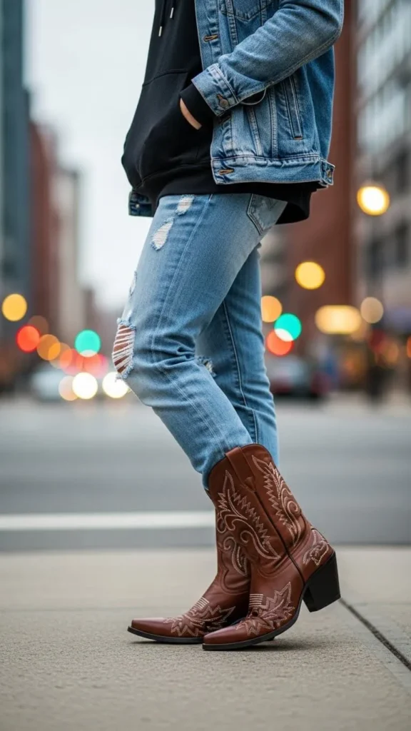 Western boots add personality. Wear them with jeans and layered tops. A hoodie under a jacket adds warmth. This outfit feels relaxed and fun. Thrift stores often have western boots at good prices.